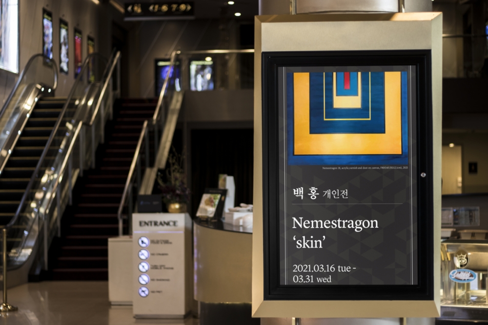 We, Gallery Art Continue, present Baek Hong’s (4th) Solo Exhibition <Nemestragon ‘skin’> from 16th to 31st of Mar., 2021. The works of Baek Hong were inspired by Mondrian’s Color-Field Abstract, who is the progenitor of neoplasticism. The Neo Plasticism, which rejects the conceptual form, is devoted to harmony, order, and basics of colors. Can be different from artists, it would be easy to draw as it appears, but it’s difficult to draw the abstract that depicts the mind of the artist. Among those abstracts, it can be more difficult to paint with just a few colors. Baek Hong's work adds a harmonious color to Color-Field Abstract, which could be monotonous, giving a sense of rhythm and healthy energy, and providing luxury.